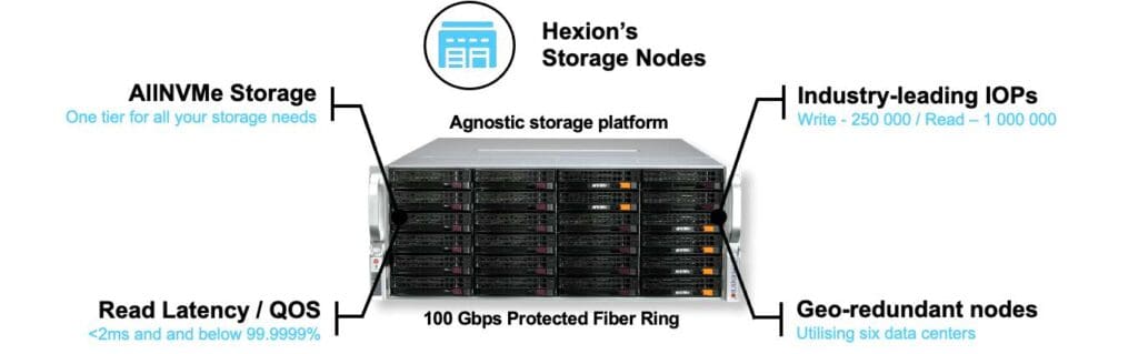 Our network employs erasure coding across six fibre-connected data centers, covering a distance of forty kilometers. With NVMe and our AllFlash strategy, Hexion provides outstanding reliability and speed.