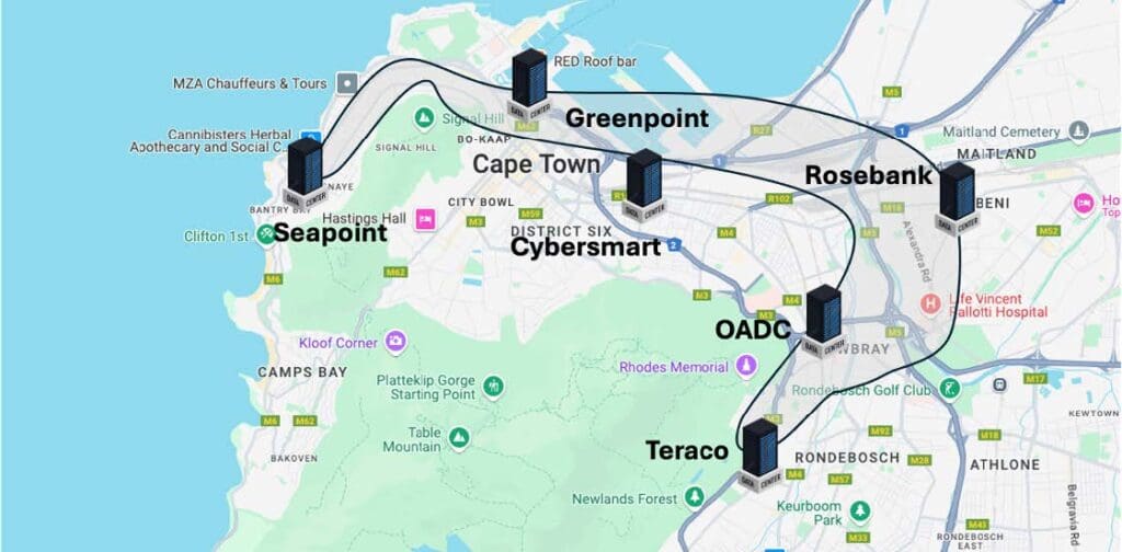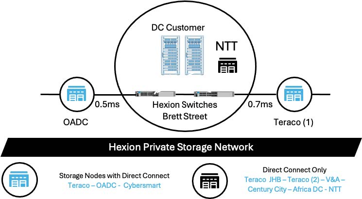 The Hexion network supports direct connect at Teraco Rondebosch, OADC, African Data Centers, V&A, Century City, Teraco Brackenfell, NTT Bree Street, and Cybersmart, further optimising data transfer performance.